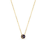 This handmade 14 karat gold diamond necklace is the perfect every day gold accessory. Its pendant features a hand-painted and two-sided blue enamel with a moon and a shining diamond star.