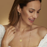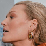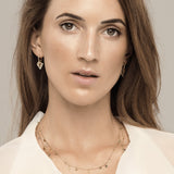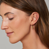 These delicate and playful gold huggie earrings are inspired by tribal forms and feature 6 different sized triangle charms dangling from the gold huggie. This lively design goes perfectly as a main earring and can be combined with other ear jewels.